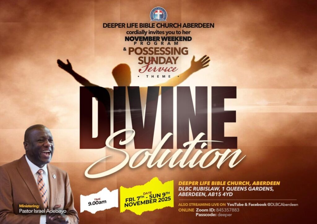 Divine Solution Weekend November 7 – 9, 2025 1 Queens Gardens, Rubislaw Aberdeen AB15 4YD Deeper Life Bible Church Directions Spread the word